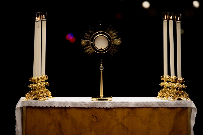 There was a candlelit path to the altar holding the Eucharist during adoration in St. Peter's Square March 14, 2023. Daniel Ibanez/CNAThe Eucharist was displayed in a gold monstrance for adoration in St. Peter's Square March 14, 2023. Daniel Ibanez/CNA