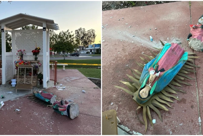 A statue of Our Lady of Guadalupe was smashed in half at Corpus Christi Catholic Church in Corona, California, on April 1.
