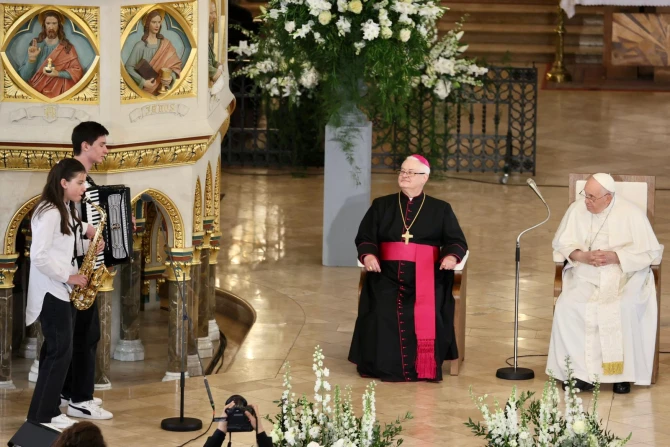 Francis was greeted at the meeting by people who shared testimonies of their struggles, including a Ukrainian family that has found refuge in Hungary. The oldest two children of the family, on accordion and saxophone, performed an Argentinean tango for the pope.