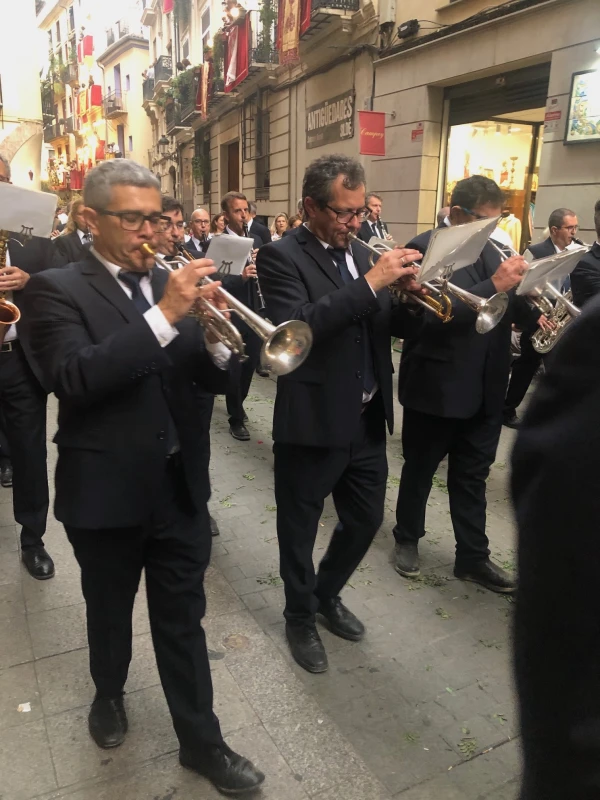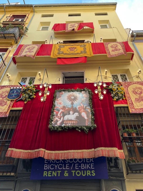 During the Valencia procession, an umbraculum precedes the monstrance and a bell alerts those who are lining the streets that Jesus is about to pass by. Those filling the balconies prepare their flowers, and the eucharistic Lord is showered with red and white petals from two, three, five floors up.