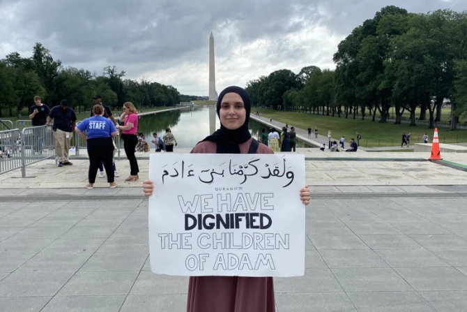 Sameerah Munshi, a recent graduate of Brown University who is interning with the Religious Freedom Institute, held a sign with a verse from the Quran about the sanctity of life that read “We have dignified the children of Adam.”