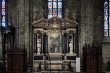 A white woolen band with six black silk crosses worn around the neck, the pallium is a symbol of an archbishop’s special share in the pope’s pastoral authority as well as his responsibility to shepherd his flock.