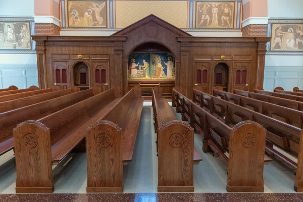 The confessionals are adorned with images of mercy from Scripture. Confessions are held six days per week and often draw 40-50 students each time. In the new church, penitents can wait in line and look at such images as Christ with Mary Magdalene, Zacchaeus, and the woman at the well. A few dozen students are baptized two times each year; the new church features a large baptismal font surrounded by representations of angels.
