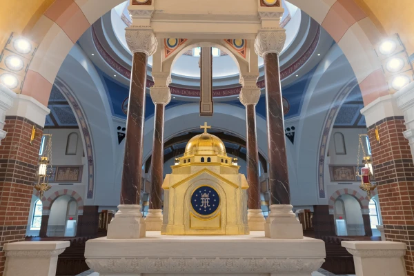 Other significant features include a rose window with an image of Christ at the center surrounded by images of creation and representations of the Apostles, colorful stained-glass windows with images of such saints as Faustina, Juan Diego, and Maximilian Kolbe, and traditional statues of such favorite saints as Thérèse of Lisieux.