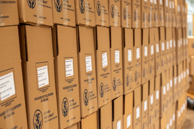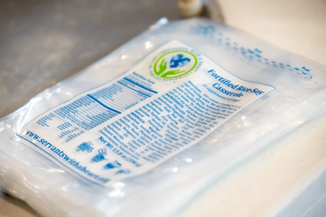 An annual fund drive, named for a former pastor who got the effort underway, pays for the raw ingredients: soy protein, dried vegetables, vitamins, and rice. These components get scooped into plastic bags — in that order. Then the bags get weighed, sealed, and packed in boxes.