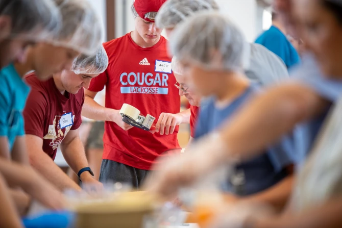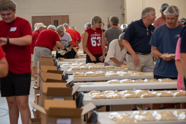 Got it? Good. Because this isn’t like selling brownies after the 5 p.m. vigil Mass. This is the big leagues of parish-based brotherly love. There are instructional videos, forklift operators, logistics experts, and three work shifts totaling more than a thousand participants organized into eight-person assembly lines.