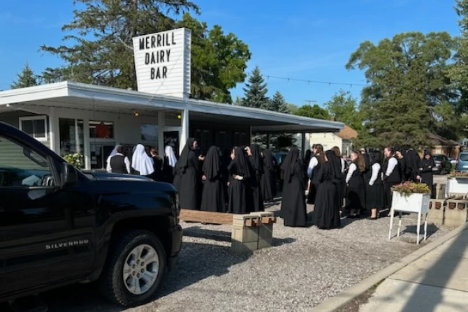 On Aug. 16, Merrill Dairy Bar — affectionately known as the Merrill Whippy Dip — in Merrill, Michigan, had the pleasure of hosting 58 members of the Religious Sisters of Mercy of Alma, Michigan. The sisters were celebrating a postulant member’s profession of vows for religious life with Bishop Robert D. Gruss of Saginaw, near Lake Huron. To commemorate the solemn event, the sisters decided to make a stop in Merrill, a rural village ringed by verdant fields of sugar beets, corn, and soybeans, on their way home to Alma.