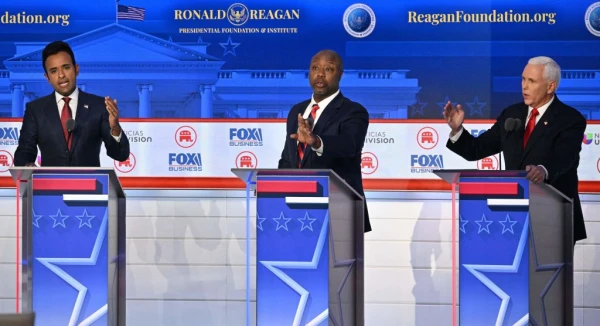 The six candidates — former New Jersey Gov. Chris Christie, Florida Gov. Ron DeSantis, North Dakota Gov. Doug Burgum, former Vice President Mike Pence, former United Nations Ambassador Nikki Haley, entrepreneur Vivek Ramaswamy, and South Carolina Sen. Tim Scott — appeared at the Ronald Reagan Presidential Library in Simi Valley, California.