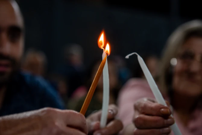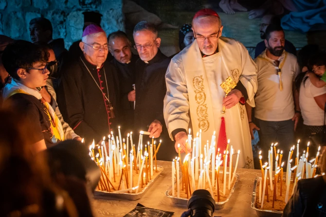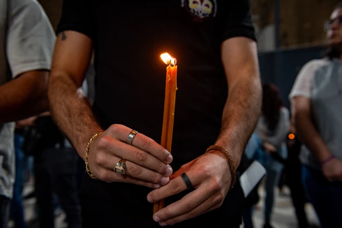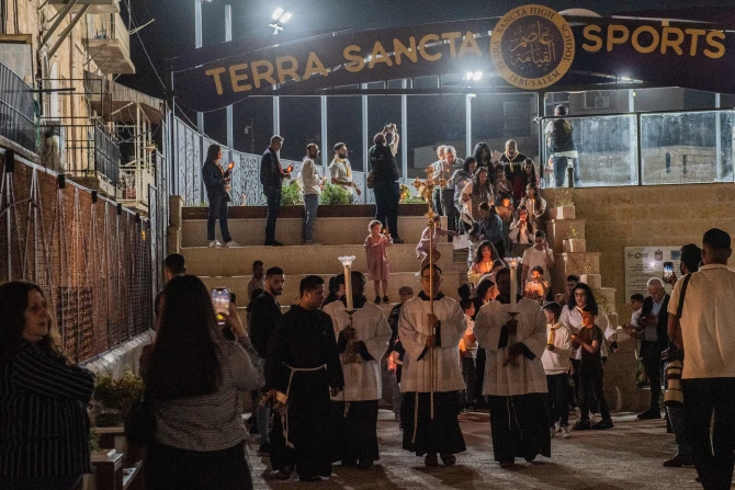 The prayer vigil ended with the lighting of candles and a small procession behind the cross. Attendees placed their candles in braziers set up for the occasion in a second courtyard of the school. In front of these flames, symbolizing the prayer rising to God, Pizzaballa gave the final blessing.