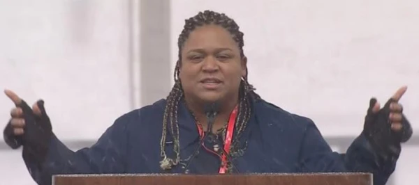 Jean-Marie Davis, executive director of Branches Pregnancy Resource Center in Vermont, addresses a crowd of thousands on the National Mall, many huddled for warmth in the blowing snow and clutching homemade pro-life signs as they prepare to march to the Supreme Court building.