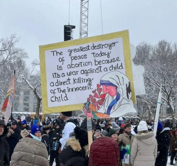 A sign features Mother Teresa at the 51st March for Life, Jan. 19, 2024. Credit: Christina Herrera / EWTN NewsA marcher displays a sign at the 51st annual March for Life, Fri., Jan. 19, 2024. Joe Bukuras/CNAA marcher displays a sign at the 51st annual March for Life, Fri., Jan. 19, 2024. Joe Bukuras/CNAA marcher displays a sign at the 51st annual March for Life, Fri., Jan. 19, 2024. Joe Bukuras/CNAA marcher displays a sign at the 51st annual March for Life, Fri., Jan. 19, 2024. Joe Bukuras/CNA