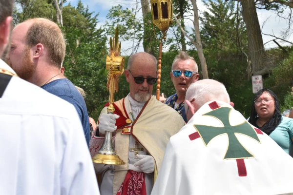 The procession — part of the National Eucharistic Pilgrimage taking place across the United States — traveled from Cloisters on the Platte, an Ignatian silent retreat center near Omaha, to the Shrine of the Holy Family, a wayside chapel beloved by locals and travelers alike.