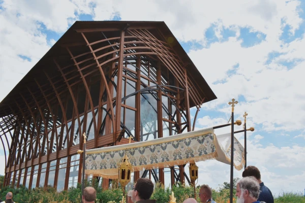 With heavy limbs and tired feet, the pilgrims made their way to the top of the hill to reach the end of the procession at the Shrine of the Holy Family, an unusual-looking building of cedar and glass that overlooks the surrounding fields and freeway, its latticed roof reaching into the clouds.