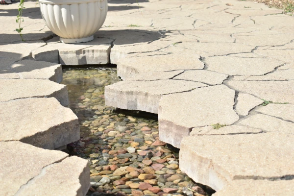 The entrance to the shrine is marked by a cracked path with a pebbled waterway just under the surface. Small pools of water mark each pew, while a larger pool sits beneath the altar.