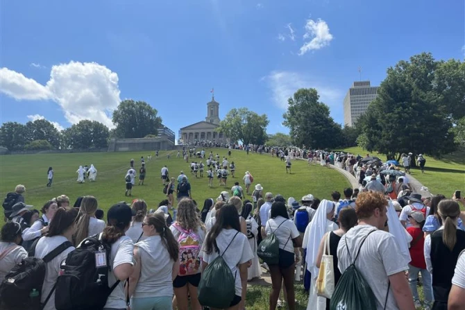 More than 1,000 Catholics processed with the Eucharist through the boisterous streets of downtown Nashville, Tennessee, on Friday, passing by tourists, party buses, and backed-up traffic to bring Christ to the Music City and pray at its historic churches.