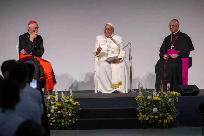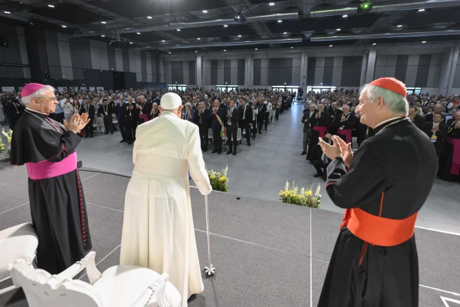 “As Catholics, on this horizon, we cannot be satisfied with a marginal or private faith,” the pope said before approximately 1,200 conference participants at the Generali Convention Center. “This means not so much to be heard, but above all to have the courage to make proposals for justice and peace in the public debate.”