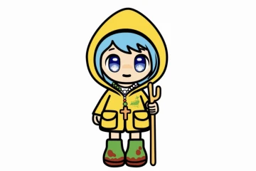 Luce, which is Italian for “light,” is a blue-haired mascot who wears a rosary around her neck and a yellow raincoat that is meant to symbolize journeying through life’s storms and reflect the color of the Vatican flag. She wears green muddy boots that represent a long and difficult journey and carries a staff meant to symbolize the pilgrimage toward eternity.