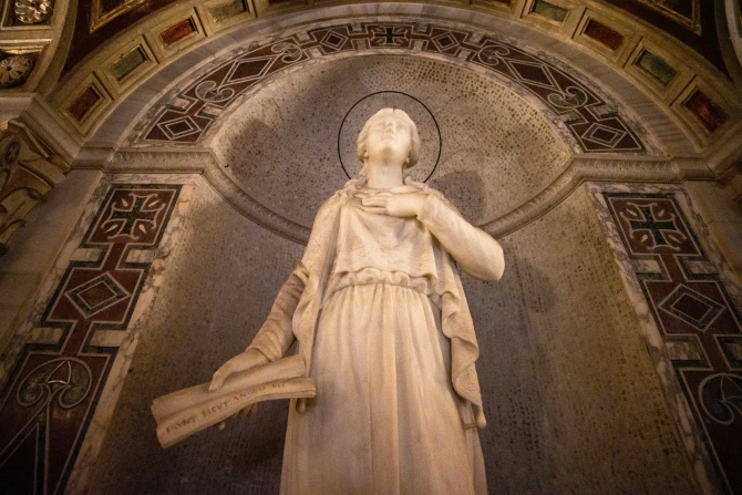 Sources disagree about whether the Baroque artwork, still on display today at Cecilia’s tomb in the Basilica of St. Cecilia in Trastevere, is a depiction of how the saint’s body was found in 1599 or an invention of Maderno. Either way, the sculpture — which depicts Cecilia lying on her right side, her hands tied, her face turned toward the ground, and the wound of her martyrdom visible upon her neck — is considered a masterpiece.