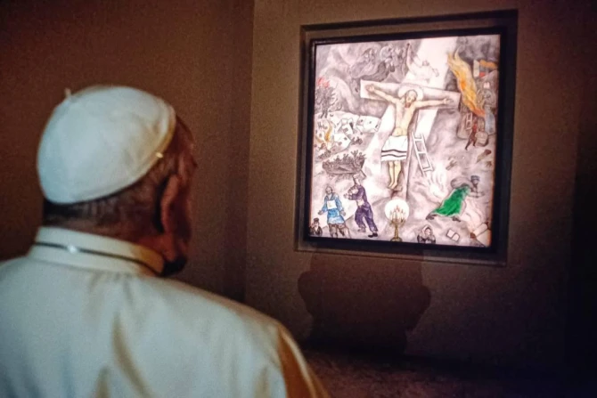 Following the Marian celebration, Francis made an unexpected stop at the Museo del Corso, where he viewed Marc Chagall’s “White Crucifixion.”