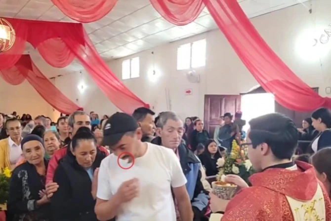 The sequence, which can be seen beginning at 1:06:11 on the Facebook page of Channel 16 in Ocotepeque, shows how the man makes an unusual gesture, moving his mouth forward to take the host from the priest’s hand instead of waiting for the priest to place it on his tongue.