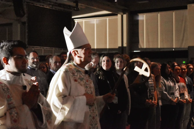 The exuberant crowd of mostly young adults grew quiet when the opening Mass began, which took place the night of New Year’s Day on the feast of Mary, Mother of God. The hymn “Sing of Mary” rang out as well over 100 priests processed through the main hall, including Salt Lake City’s Bishop Oscar Solis. It took two processional songs for all the priests to process in, kiss the altar, and take their seats.