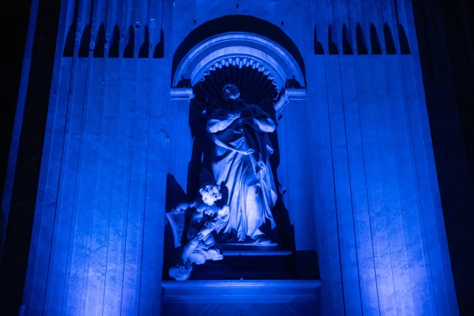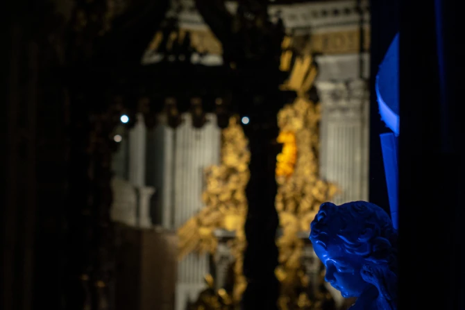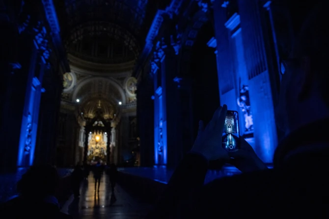 The after-hours opening of the basilica, one of several events in Rome organized for the Feb. 15–18 Jubilee of Artists and the World of Culture, was called the “Notte Bianca” — “white night” in English. During the extraordinary opening, artists and others walked around a basilica bathed in blue light and accompanied by live cello music.