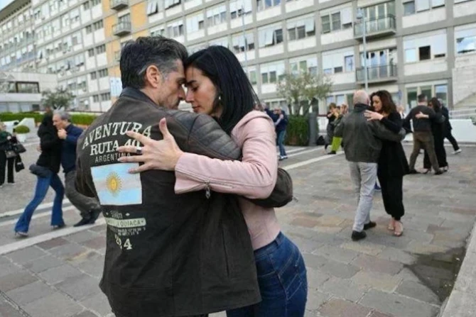 A group of tango enthusiasts, the emblematic dance of Pope Francis’ homeland, gathered in the plaza in front of Gemelli Hospital on Sunday to express their support and closeness to the Holy Father through dance.