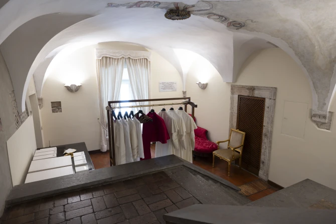 The antechamber holds three sizes of papal vestments — small, medium, and large — as well as boxes of papal shoes.