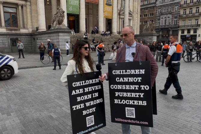 Police in Brussels arrested pro-life activist Lois McLatchie Miller and child protection advocate Chris Elston on Wednesday for peacefully displaying signs that advocated for the protection of children against transgender medical treatments.