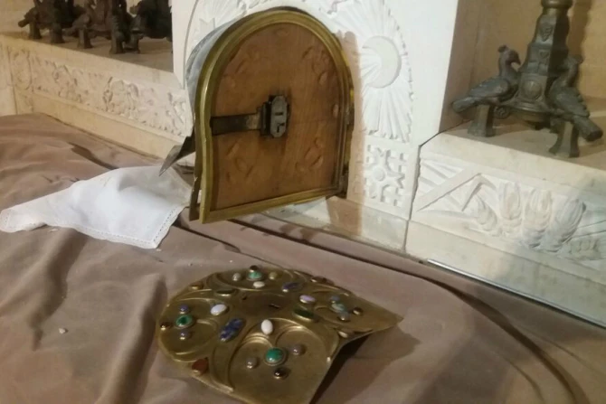 Unknown burglars robbed the church Oct. 24. They destroyed the tabernacle, desecrated the Hosts, and stole the ciborium after throwing the Hosts on the floor.