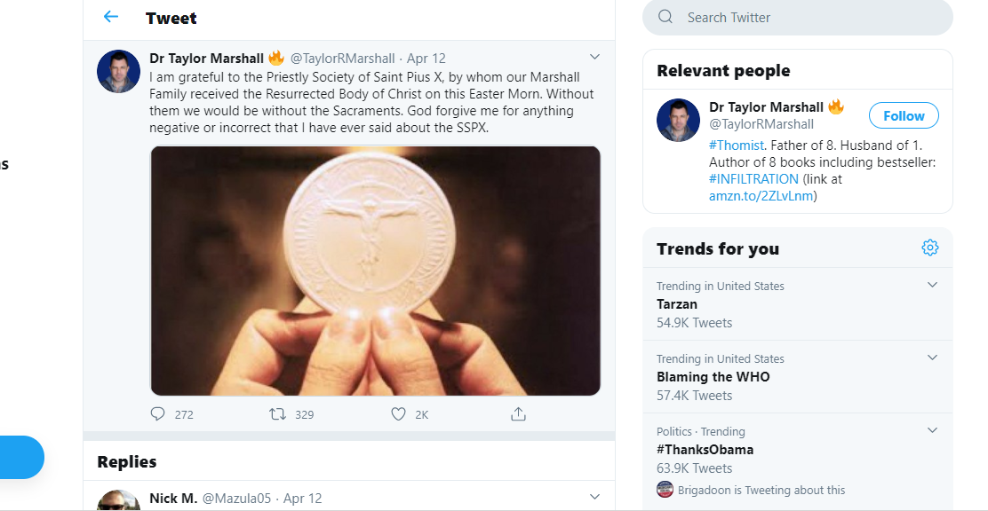 In recent weeks, the president's Twitter account has cited support from two figures with polarizing reputations among Catholics: former papal nuncio to the United States Archbishop Carlo Maria Viganò, and the author and online polemicist Taylor Marshall.