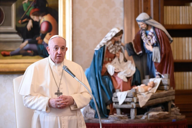 The pope gave his final general audience address of 2020 in the library of the apostolic palace, where the weekly event has been held since October because of rising coronavirus cases in Italy.