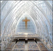 The church, measuring 300 feet long and 150 feet wide, will seat more than 3,300 people, giving it the largest seating capacity of any Catholic church in the U.S. The exterior wall at the entrance will feature a 60-foot red-tinted glass cross, with a 40-foot corpus. Inside, the sanctuary features another large crucifix.