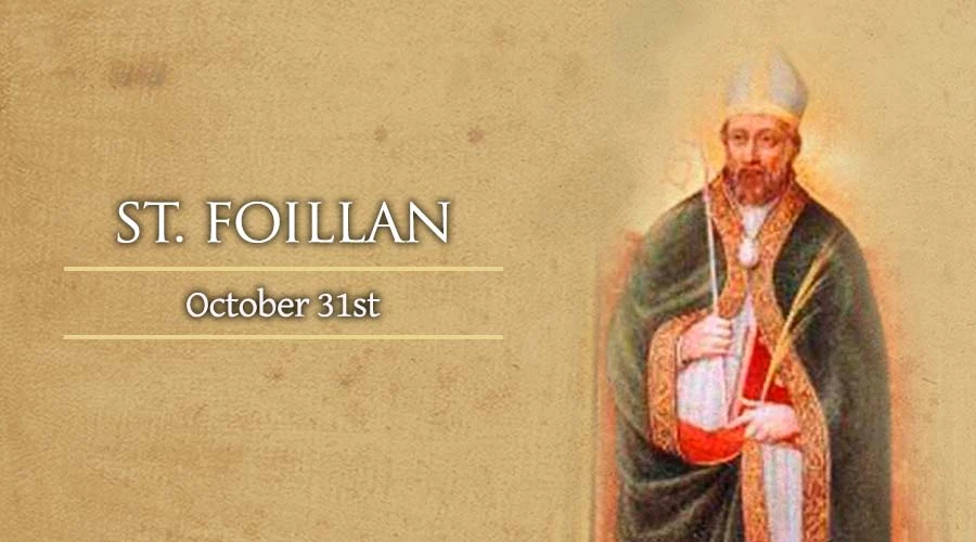 St. Foillan was born in 7th-century Ireland and was the brother of St. Fursey and St. Ultan. He joined them in England, where they were working as missionaries, and had established a monastery near Yarmouth.