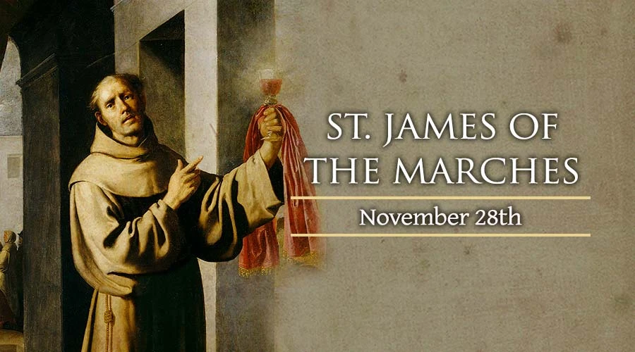 St. James of the Marches was a Franciscan priest in the 15th century. He was born into a poor family in Monteprandone, Italy in 1391 and was educated by his uncle who was a priest. He continued his education, eventually achieving the degree of Doctor in Canon and Civil Law from the University of Perugia. He worked for some time as a tutor in a noble family, but on July 26, 1416, he was received into the order of Friars Minor in the Chapel of the Portiuncula in Assisi.
