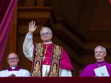 Pope Leo XIV waves to pilgrims in St. Pete’s Square shortly after his election on Thursday, May 8, 2025.