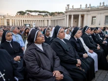 Religious sisters gather to pray the rosary for Pope Francis in St. Peter’s Square at the Vatican, Monday, April 21, 2025.